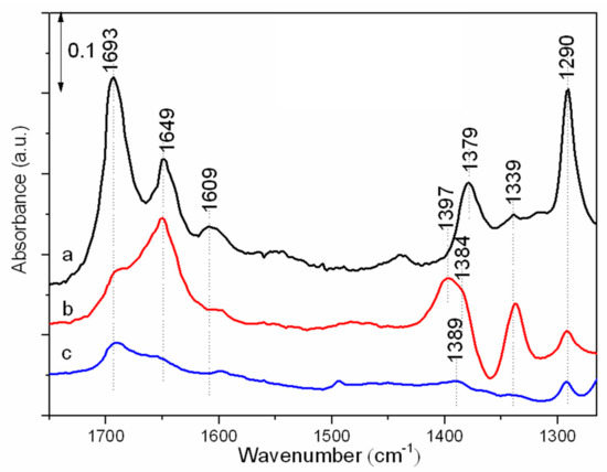 The FT-IR spectra of methanol absorbed on CsX at 140 °C are shown in Figure 5. The strong band at 1693 cm−1 is attributed to the C=O stretching vibration of formaldehyde [27]. The sharp band at 1290 cm−1 should be also related to formaldehyde, due to its relative intensity being consistent with the signal of 1693 cm−1 at different operation conditions. The two bands appearing at 1649 and 1379 cm−1 could be assigned to the stretching vibrations of C=O and C–O in surface-adsorbed unidentate formate [27,28], while the signals at 1609 and 1339 cm−1 (weak) are assigned to asymmetric and symmetric O–C–O stretching modes of the adsorbed bidentate formate [27]. Previous literature works revealed that unidentate formate derived from the further activation of formaldehyde is the main active intermediate for the side-chain alkylation reaction, while bidentate formate is an undesirable intermediate, which is mainly related to the formation of CO and H2 [29].