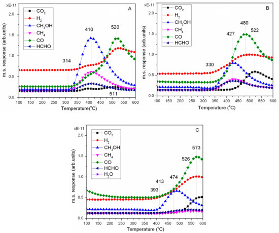 Brunauer–Emmett–Teller (BET) surface areas and pore volumes of the samples were measured by N2 adsorption at −196 °C using a Micromeritics ASAP 2010N analyzer (Micromeritics instrument Ltd. Shanghai, China). The samples were pretreated under a vacuum at 250 °C for 12 h prior to the measurement. The temperature programmed desorption (TPD) of CO2 and NH3 was used to determine the properties of base and acid. The fresh sample (50 mg, 40–60 mesh) was calcined at 550 °C for 1 h in He flow, then cooled down to 100 °C in order to adsorb CO2 or NH3 for 0.5 h. After the excess CO2 or NH3 was removed by flowing He for 1 h at 100 °C, the temperature programmed desorption was carried out at a rate of 10 °C /min in He (30 mL/min), and the desorbed CO2 or NH3 was monitored online by a thermal conductivity detector (Micromeritics instrument Ltd. Shanghai, China). The toluene TPD was also obtained using the abovementioned method. Methanol decomposition and desorption were monitored by a quadrupole mass spectrometer (Omni StarTM, Pfeiffer Vacuum Co., Ltd. Shanghai, China). TPD and thermal evolution profiles were recorded by monitoring the intensity of different m/e fragments as a function of temperature. The crystal structures of samples were characterized on a Shimadzu XRD-6000 diffractometer (40 kV and 30 mA) (Shimadzu Global Laboratory Consumables Co., Ltd., Shanghai, China) using Ni-filtered Cu Kα radiation. Scanning electron microscope (SEM) images and EDS mapping were measured with a Hitachi X-65.