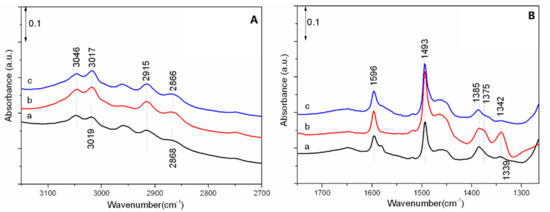 FT-IR spectra of surface species remaining on (a) CsX, (b) 0.15 Fe/CsX-I, and (c) 0.15 Fe/CsX-II after exposure to 1000 Pa toluene at 50 °C for 30 min and subsequent sequential evacuation at 140 °C, (A) Wavenumber range in 3150–2700 cm−1, (B) Wavenumber range in 1750–12500 cm−1.