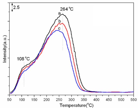 Temperature programmed desorption of toluene over catalysts: (a) CsX, (b) 0.15 Fe/CsX-I, and (c) 0.15 Fe/CsX-II.