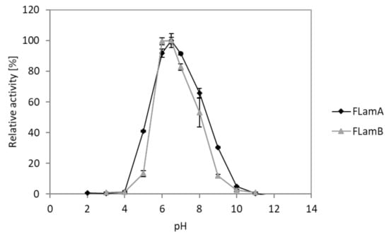4.3. Heterologous Expression of the flamA and flamB Genes and Purification of the Endo-β-1,3-Glucanases