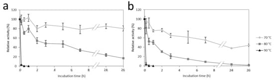| T (°C) | Specific Activity (U/mg) | Relative Activity (%) | T (°C) | Specific Activity (U/mg) | Relative Activity (%) | |