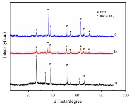 In order to qualitatively and quantitatively analyze the phase composition of as-prepared samples, X-ray diffraction (XRD) patterns of FTO, TiO2/FTO before anneal, and TiO2/FTO after anneal were recorded in Figure 1. From Figure 1, expect the diffraction peaks (denoted by “#”) indexed to FTO (Figure 1a), the other diffraction peaks (denoted by “*”) of TiO2/FTO before anneal (Figure 1b) can be well identified as TiO2 with the tetragonal rutile crystal (JCPDS No. 21-1276). No characteristic peak assigned to anatase or brookite phase was detected, indicating the high purity of TiO2 prepared by hydrothermal method in this work. After being annealed at 450 °C for 90 min, the peaks assigned to rutile TiO2 became sharper and the relative intensities were significantly enhanced. Moreover, no additional diffraction peak was observed (Figure 1c). These results indicate that the heat treatment not only not destroyed the crystal structure, it also improved the crystalline quality of rutile TiO2.