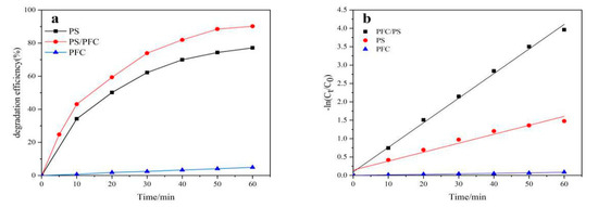 In addition, according to the analysis of degradation kinetics, the pseudo first-order kinetic equation was found to fit the experimental data well (Figure 3b). The kinetic parameters including apparent rate constant k and correlation coefficient R2 for each system are listed in Table 1. It shows that k in the PFC/PS system (6.69 × 10−2 min−1) is the greatest, that in PS (2.44 × 10−2 min−1) is the second, and that in PFC (1.40 × 10−3 min−1) is the smallest, which is in accordance with the variation tendency of NOR degradation. These results demonstrate that the superior performance of PFC/PS combined system for accelerating the degradation of NOR.