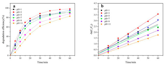 In order to clarify the effect of pH, the NOR degradation processes were carried out at different initial solution pH values in PFC/PS system. As shown in Figure 5a, during the first 30 min, the degradation efficiency increased with a decreasing initial solution pH from 11.0 to 3.0. Nevertheless, when the initial solution pH further decreased to 1.0, the degradation efficiency slightly reduced compared with that at initial solution pH 3.0. With prolonging the degradation time, the degradation efficiency continuously increased when the initial solution pH values were 3.0, 5.0, 7.0, 9.0, and 11.0. To the contrary, the degradation efficiency remained unchanged at the initial solution pH 1.0. Within 60 min, the degradation efficiency varied decreasingly with the initial solution pH value in the following sequence: 3.0, 5.0, 7.0, 1.0, 9.0, and 11.0. The maximum degradation efficiency was 97.19% at pH 3.0. However, the variation of 60-min degradation efficiency was not so remarkable. According to the pseudo first-order kinetic analysis (Figure 5b), the corresponding apparent rate constant values (k) for NOR degradation at pH of 3.0, 5.0, 7.0, 1.0, 9.0, and 11.0 were 5.64 × 10−2 min−1, 4.79 × 10−2 min−1, 4.10 × 10−2 min−1, 3.96 × 10−2 min−1, 3.56 × 10−2 min−1, and 2.99 × 10−2 min−1, respectively (Table 2). The decomposition of NOR and the variation of k were identical.