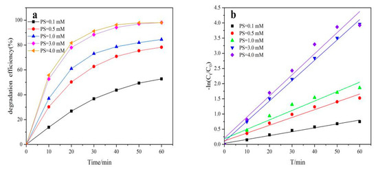 Effect of PS concentration on degradation efficiency of NOR (a) and the corresponding pseudo first-order kinetics fitting (b). Experimental conditions: [NOR] = 10 mg/L, pH = 3, and electrolyte: 0.1 M Na2SO4.