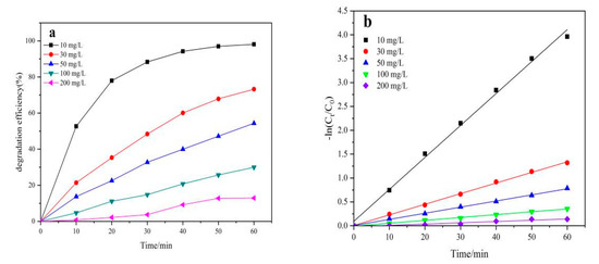 The effect of initial concentration of NOR was investigated (Figure 7). As shown in Figure 7a, the degradation efficiency of NOR was reduced sharply from 98.10% to 12.92% with increasing NOR concentration from 10 mg/L to 200 mg/L. All the degradation processes at different NOR concentrations were fitted well with pseudo first-order kinetics model (Figure 7b) and the calculated rate constants and other parameters were exhibited in Table 4. The variation of the rate constants is similar to that of degradation efficiency. Namely, the corresponding rate constant decreased gradually from 6.69 × 10−2 to 2.70 × 10−3 min−1, with an increasing NOR concentration from 10 to 200 mg/L.