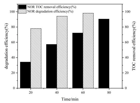 In order to investigate the mineralized degree of NOR, the TOC variation of the NOR solution with an initial concentration of 10 mg/L during the degradation process in PFC/PS system was analyzed. The degradation experiment was performed under the optimal conditions (pH = 3.0, [PS] = 3 mM, and 0.1 M Na2SO4 as electrolyte). As shown in Figure 8, the TOC removal efficiency was lower than the degradation efficiency at the same treatment time. Within 60 min, the degradation efficiency of NOR reached 98.1%, indicating that NOR was almost completely degraded. At the same time, the TOC removal efficiency was only 72.3%, which suggested that despite the fact that 27.7% NOR had been transformed to its intermediates, the PFC/PS system still had the capacity to effectively degrade NOR under the optimal conditions. After a further prolonging 20-min treatment time, it was observed that the TOC removal efficiency reached 90.5%, showing the hysteresis quality of NOR mineralization and the potential of PFC/PS system in refractory organic pollutant treatment.