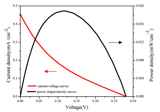 Figure 4 shows the current-voltage (I-V) curves and the corresponding power density curves of PFC and PFC/PS system to compare their electricity generation performance. Obviously, the PFC/PS system exhibits the better electricity generation performance with an open-circuit potential (Voc) of 0.5 V and a short-circuit current density (Jsc) of 0.290 mA·cm−2, with 0.4 V and 0.270 mA·cm−2, respectively, for the PFC system (Figure 4a). The maximum output power (PMax) of PFC/PS is 0.036 mW·cm−2, which is nearly two times higher than that in the PFC system (0.018 mW·cm−2) (Figure 4b). These results reveal the efficient electricity output of PFC/PS system and such a high performance is attributed to the synergy of PFC and PS.
