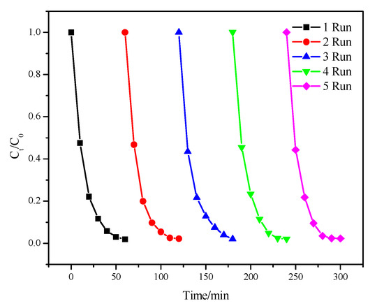The stability of the PFC/PS system plays an important role in its practical application. As shown in Figure 12, after five times of continuous runs for NOR degradation in PFC/PS system under the optimal conditions, no significant loss was observed for the photocatalytic performance of PFC/PS system.