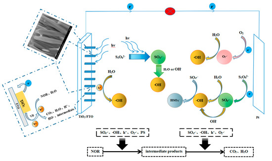 According to the aforementioned analysis, a tentative function mechanism for the degradation of NOR in PFC/PS system was proposed and illustrated in Scheme 1. In PFC/PS system, the degradation of NOR took place both in the solution and on the surface of TiO2 nanorods. Under the irradiation of UV light, the photogenerated hole and electron separated and transferred to the surface of TiO2 nanorods (Equation (10)). Then, a portion of the photogenerated hole directly participated in the degradation reaction of adsorbed NOR on the surface of TiO2 nanorods (Equation (11)), and a portion of h+ reacted with water to produce ·OH (Equation (12)); the other part of the hole recombined with the electron inevitably. The limited quantity of h+ showed that it played a minor role in the NOR degradation. After transferring to the surface of Pt electrode from TiO2 nanorods through the external circuit, electrons effectively excited the adsorbed PS molecules to decompose and generate SO4·− (Equation (13)). Moreover, the dissolved oxygen molecules could also react with electrons to form O2·− (Equation (14)). On the one hand, the content of dissolved oxygen molecules in the solution is low and constant; on the other hand, generated O2·− could partially transformed into ·OH through the reaction with water in the solution (Equation (15)). Thus, O2·− also played a minor role in the NOR degradation. In the solution, SO4·− could also be generated via the UV light excitation of PS (Equation (16)). Under certain conditions, the transform reaction from generated SO4·− to ·OH also occurred in the solution (Equations (4) and (5)). Finally, according to the Equations (11), (17)–(21), the degradation of NOR occurred both in the solution and on the surfaces of TiO2 nanorods by the oxidation of radicals (O2·−, ·OH, SO4·−), h+, and PS.