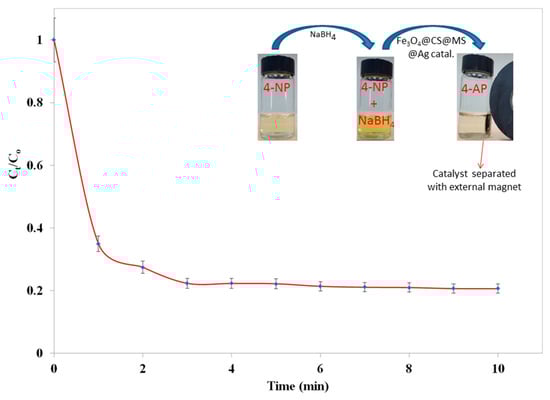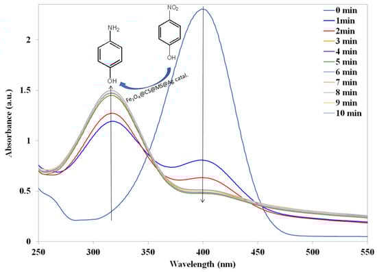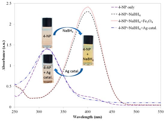 red color spectrum). However, when silver nanoparticles deposited surface modified magnetic chitosan catalyst Fe3O4@CS@MS@Ag (1.5 mg; 1.2 × 10−6 mol Ag) was added to the aqueous solution of 4-NP and NaBH4 mixture, immediately the color of the reaction mixture turned to very light yellow. This color change was estimated by UV-Vis absorption (Figure 7;