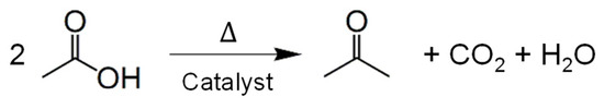 - Pham, T.N.; Shi, D.; Resasco, D.E. Kinetics and Mechanism of Ketonization of Acetic Acid on Ru/TiO2 Catalyst. Top. Catal. 2014, 57, 706–714. [Google Scholar] [CrossRef]
