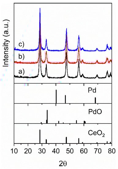 X-ray diffraction (XRD) patterns of the samples: (a) ceria nanorods (CeO2-NR), (b) PdOx/CeO2-NR, and (c) reduced PdOx/CeO2-NR (PdOx/CeO2-NR-Red).