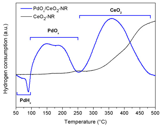 A H2-TPR experiment was performed to analyze the reducibility and the oxygen storing capacity of PdOx/CeO2-NR. The reduction was conducted up to 500 °C and maintained at the final temperature for 1 h, to avoid any sintering of ceria and of Pd at higher temperatures. H2-TPR profiles of CeO2-NR and PdOx/CeO2-NR are reported in Figure 2. The profile of the pure CeO2-NR shows a broad reduction feature with onset at about 300 °C, increasing up to 500 °C, assigned to Ce4+ → Ce3+ reduction on the surface of ceria [48,49].