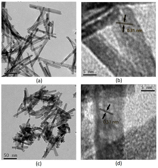 CeO2-NR and PdOx/CeO2-NR were investigated by TEM and the images are shown in Figure 3. The CeO2-NR sample showed a uniform well-developed structural anisotropy characteristic of the rod-like morphology with the average length of 110 nm and the average width of 9 nm (Figure 3a). In addition, 0.31 nm fringe distances assessed in CeO2-NR and PdOx/CeO2-NR (Figure 3b, d) were in good agreement with d value of the ceria (111) plane and were the only crystalline planes observed. In some published researches, (100) and (110) exposed planes are reported for CeO2-NR [38,46,56]. However, palladium supported on the (111) plane of CeO2 seems to have a particular synergy with the support, showing higher activity and selectivity in methane combustion, CO oxidation, and BnOH oxidation [38,39,43]. As shown in Figure 3c, after palladium deposition, the average length of nanorods decreased up to 55 nm. The lack of evidence of palladium particles in the HRTEM images of PdOx/CeO2-NR, might be attributable to the high dispersion of palladium oxide species on the surface of the support, in agreement with XRD analysis.