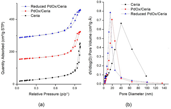 Brunauer–Emmett–Teller (BET) analysis was utilized to estimate the surface areas of pure support CeO2-NR, PdOx/CeO2-NR, and PdOx/CeO2-NR-Red catalysts (Figure 4 and Table 1). The BET surface area of pure ceria nanorods was 116 m2g−1, comparable to the 106 m2g−1 reported by Wang et al. [46] for ceria nanorods prepared by the same method. The surface area of PdOx/CeO2-NR was 88 m2g−1, in agreement with analogous Pd/CeO2 system [44]. As expected, the palladium deposition caused a decrease of support surface area. The BET surface area of PdOx/CeO2-NR-Red was 93 m2g−1, slightly higher than the surface area of PdOx/CeO2-NR. This might be attributable to the decrease of the amount of palladium on the surface or to the decrease of Pd particle size.