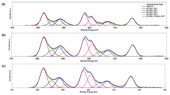X-ray photo electron spectroscopy (XPS) spectra of Ce 3d region for the samples: (a) CeO2-NR, (b) PdOx/CeO2-NR, and (c) PdOx/CeO2-NR-Red. All Ce 3d5/2 spin-orbit components, as well as the Ce 3d3/2 peaks at higher BE (binding energy) values (diagnostic for the presence of Ce4+ ions), appear as bold lines in the spectra.
