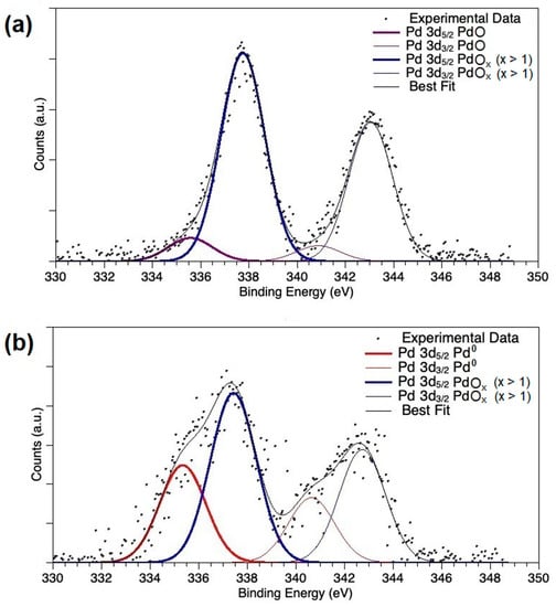 Photoelectron profiles of PdOx/CeO2-NR and PdOx/CeO2-NR-Red are shown in Figure 6, and the detailed atomic percent values of observed Pd species are reported in Table 2. The most intense signal in Pd 3d spectrum of PdOx/CeO2-NR has the Pd 3d5/2 component at 337.76 eV BE, a binding energy value indicative for oxidized palladium (PdOx, x > 1); the less intense component at lower BE values (Pd 3d5/2 BE = 335.58 eV) is associated with 10% of PdO [58].