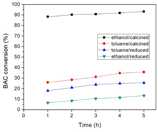 Due to the low BnOH conversion in toluene (9–35%), other solvents were utilized, namely acetonitrile (AcCN), ethanol, methanol, and tetrahydrofuran (THF). The oxidation of BnOH, using different solvents at nearly 65 °C after 5 h, is presented in Table 3. The highest conversions were achieved using ethanol and methanol as solvents (50% and 41%, respectively). In the same conditions, the BnOH conversions using either toluene or AcCN were 14% and 6%, respectively.