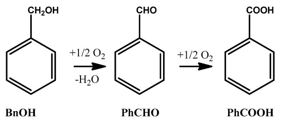Benzaldehyde (PhCHO) is considered a critical fine and intermediate chemical [8]. Oxidation of toluene and hydrolysis of benzal chloride are common ways of PhCHO production; but in the former the selectivity is low, and the latter leads to undesirable chlorine contamination [9]. PhCHO can be produced from catalytic oxidation of benzyl alcohol (BnOH) using environmentally friendly oxidants such as air or O2, which are advantageous over the expensive and toxic stoichiometric oxidants such as chromium and manganese salts [10]. The oxidation can proceed through PhCHO to benzoic acid (PhCOOH) as the final product [11] (Scheme 1); therefore, it is crucial for a catalytic system to show high PhCHO selectivity.