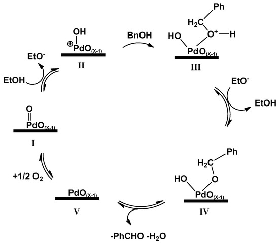 The mechanism of the alcohol’s oxidation over Pd0 has been extensively studied [61,62,63,64]. It foresees oxygen chemisorption on palladium surface, assisted homolytic cleavage of the O–H bond of BnOH mediated by oxygenated Pd, and formation of an alkoxide–palladium bond and a PdOH. The subsequent hydrogen abstraction by a near Pd0, permits the release of the PhCHO and of a molecule of water.