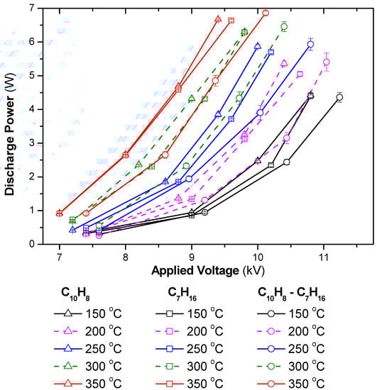 Discharge power as a function of temperature and applied voltage for different gas compositions (total flow rate fixed at 2 L/min including 3.7% H2O, 10%O2, reducing agents: 48 ppm C10H8, 265 ppm C7H16, N2 as balance; acquire mode of the oscilloscope: average of 128 waveforms).