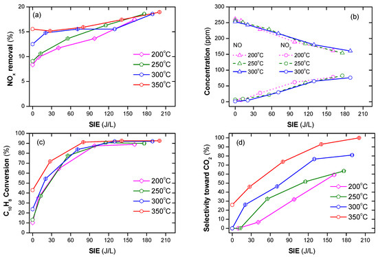 Naphthalene (soot simulant) played the role of the reducing agent in the SCR of NOx as shown in Figure 2a. The conversion of NOx was 8 to 20% in the temperature range of 200–350 °C along with SIE of 0–210 J/L. The SIE is defined as the power in W divided by gas flow rate in L/s. The removal of NOx tended to increase with the increasing temperature and SIE. The previous reports indicated that without a reducing agent, NOx removal neither occurred in the plasma nor in the plasma-catalyst processes, only in the oxidization of NO to NO2 [42,50]. Naphthalene containing two aromatic rings can function as a reducing agent [27,56]. Similar to other hydrocarbons, naphthalene produces partially oxidized intermediate products. Subsequently, NOx reduction is performed via the chemical reactions with the intermediate products. For this experiment, the concentration of naphthalene was 48 ppm. It is argued that this low concentration is the reason for the low NOx removal. Figure 2b shows the concentration of NO and NO2 when the temperature varies from 200 to 300 °C and SIE varies from 0 to 210 J/L. This demonstrated that a part of NO was oxidized to NO2 in the presence of plasma. The catalytic destruction of naphthalene hardly occurs at low temperatures because it is stabilized by resonance hybrid, i.e., high temperature and high SIE are needed for the decomposition of this compound. Figure 2c indicates that, even at an operating temperature of 350 °C, naphthalene conversion was approximately 40%. However, almost all naphthalene was destroyed with SIE above 90 J/L in the temperature range of 200–350 °C. Furthermore, the selectivity toward CO2 increased as the temperature and SIE increased, as shown in Figure 2d. Overall, the soot simulant (naphthalene) can function as a reducing agent of SCR for NOx removal. Further, poor catalytic destruction of naphthalene at low temperatures can be overcome with the help of plasma.