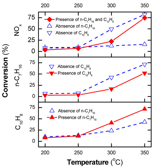 The presence of n-heptane, at operating temperatures at or above 300 °C or the presence of plasma at low temperatures, can account for the increase in NOx and naphthalene removal. This is in line with the previous report [50], which indicated that the conversion of n-heptane to derivative hydrocarbons or CO2 started to occur at 290 °C over the Ag/α-Al2O3 catalyst, whereas the plasma-catalyst process induced n-heptane conversion at a low operating temperature. Consequently, with the catalyst alone, n-heptane neither enhanced the removal of NOx nor that of naphthalene at a low operating temperature (≤250 °C), as shown in Figure 4. The conversion of NOx and n-heptane by the catalytic process decreased in the presence of naphthalene. These phenomena are caused by the adsorption of naphthalene on the catalyst, which deactivates the catalytic active sites. However, the issue was solved by using plasma. Consequently, at high SIE (≥90 J/L) and operating temperatures at or above 300 °C, more than 70% of NOx, naphthalene, and n-heptane were converted.