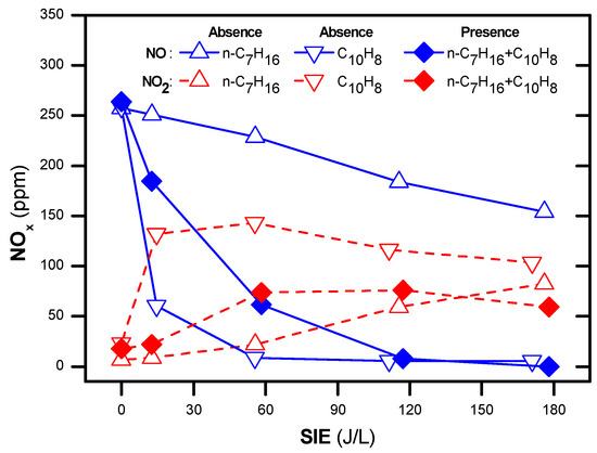 Concentrations of NO and NO2 as a function of SIE for different gas compositions at 250 °C (total flow rate of 2 L/min including: 300 ppm NO, 265 ppm n-heptane, 48 ppm naphthalene, 3.7% H2O, 10% O2 and N2 as balance).