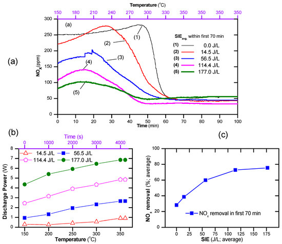 The catalyst temperature window was expanded by the presence of plasma, as shown in Figure 6. As seen, the catalyst-alone process reduced the concentration of NOx effectively when the operating temperature was above 300 °C. On the contrary, the plasma catalyst can obtain a low concentration of NOx at operating temperatures from 150 °C upward. The concentration of NOx decreased with increasing SIEavg. However, at a high temperature (≥300 °C) and high SIE (177 J/L), the NOx concentration increased slightly due to the generation of NOx by plasma, as shown in Figure 6a. As indicated by the above result, the discharge power depends on the discharge state, i.e., the temperature, applied voltage, and gas composition. Therefore, during a temperature fluctuation, the discharge power necessarily changed with the processing time. As seen in Figure 6b, the discharge power increased with the operating temperature. The average SIE, i.e., SIEavg, can be estimated using Equation (8), and the average NOx removal using Equation (9). As a result, the average NOx removal within the first 70 min as a function of average of SIE was plotted as shown in Figure 6c. This suggests that poor NOx removal under the conditions of a temperature fluctuation during the catalytic process can be improved by the combination of plasma with an average SIE of 60–120 J/L.