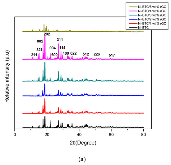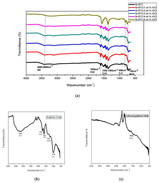 The functional groups’ presence in Ni-BTC-MOF/rGO was verified with the help of FTIR, as illustrated in Figure 2a.The stretching vibrations of OH groups of physically adsorbed water show a broad adsorption band in the range of 3600–3000 cm−1 [43,47,48]. The absence of significant peaks in the region of 1800–1680 cm−1, as well as deviation of peaks from 1715 to 1608 cm−1, clearly indicate complete deprotonation of the COOH group of benzene tricarboxylic acid (BTC) ligands and the linking of ligands with metals, which is further proved by the metal–ligand peak at 720 cm−1 [44,49]. Furthermore, the distinctive bands of the COOH group caused by asymmetric and symmetric vibrations appear in the ranges of 1645–1550 cm−1 and 1470–1390 cm−1, respectively. The C=C stretching vibration leads to a strong absorption band at 1628 cm−1 in Ni-BTC/5 wt % rGO, and a less intense peak in other composites (i.e., Ni-BTC/1–4 wt % rGO and pure Ni-BTC). The covalent interactions of an organic linker strongly alter the extended aromatic character of rGO through conversion of carbon atoms from sp2 to sp3 hybridization, which results in a decrease of sp2−C=C bond absorption frequency (i.e., stretching). However, in this case, the peak intensity of sp2 carbon atoms is increased. These results clearly reveal the lack of covalent interaction between rGO and Ni-BTC-MOF [50]. A peak at 1392–1380 cm−1 corresponds to C=O, showing symmetric stretching. The following peaks also reflect metal deprotonation with ultimate linking of metal with oxygen and successful synthesis of composites [51,52]. While the peaks at 800 cm−1 caused by C−C stretching vibration and out-of-plane deformation vibration of the C−H group in the benzene ring are present in all samples, their intensity is higher in the 5 wt % sample because of its high rGO content [50].