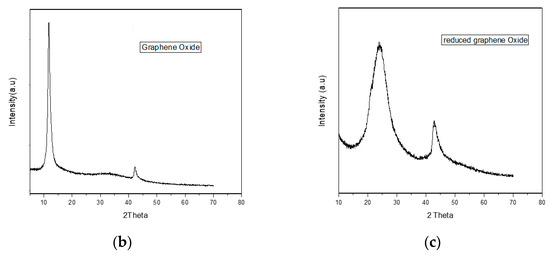In the FTIR spectrum of GO, strong absorption bands caused by the stretching vibration of hydroxyl O−H, carbonyl C=O, and carbon to carbon double bond C=C appear at 3200 cm−1, 1722 cm−1, and 1622 cm−1, respectively, while epoxy and alkoxy groups give stretching vibration peaks at 1220 cm−1 and 1048 cm−1, respectively. Reduction of oxygen-containing functional groups on the surface of GO by hydrazine hydrate is illustrated in the FTIR spectrum of rGO by the disappearance of peaks at 1722 cm−1 and 1220 cm−1, while the presence of O−H functional groups (O−H) with low intensities cause a peak at 3247 cm−1, further confirming sp2 lattice recovery with a peak at 1650 cm−1 [46].