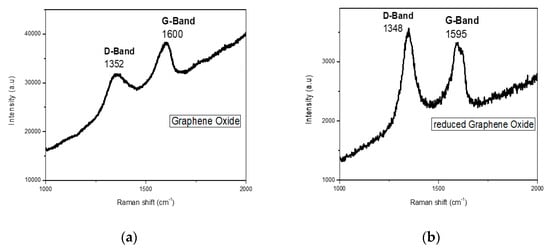 The intensity ratio of D and G bands (0.92), depicting structural defects and disorder, is clear evidence of oxidation of graphite. On the same grounds, the D band of rGO at 1348 cm−1 and G band at 1595 cm−1 in (Figure 3b) appear to be caused by structural defects and stretching vibration of sp2 hybridized C=C in aromatic groups, respectively. The ID/IG ratio obtained in this case is 1.42, which reveals insufficient structural recovery of rGO and existence of sp3 after functionalization [53,54].