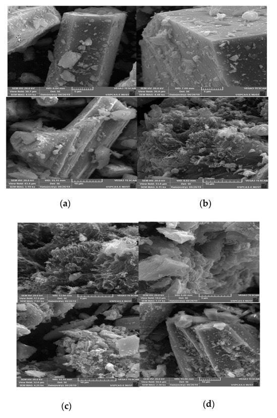 The crystal structure and morphology analysis performed through SEM confirm that the hexagonal, rod-like structures in all synthesized materials (Figure 4a) closely match with reported literature [42]. Moreover, rGO flakes are also clearly visible in prepared composite materials, present between MOF crystals (Figure 4b–g).