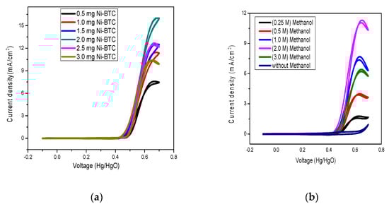 (a) Effects of catalyst load amount and (b) different molarities of methanol on current density.