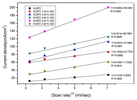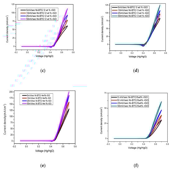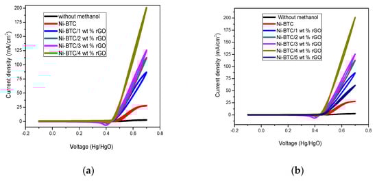 From Figure 6a, it is clear that the current density shown by Ni-BTC-MOF at 50 mV/s is only 27.155 mA/cm2, while the current densities possessed by 1–4 wt % rGO composites are 86.346 mA/cm2, 112.035 mA/cm2, 125.829 mA/cm2, and 200.22 mA/cm2, respectively; the 5 wt % rGO composite current density tends to be lower. From the results it is clear that incorporation of rGO is responsible for the increase in current density for 4 wt % rGO composites, which then decreases, as illustrated in Figure 6b. The main reason behind this is the development of additional pores in the already developed porous structure of Ni-BTC-MOF, dispersion of MOF nanoparticles on the surface of rGO, easy availability of active sites, and the enhanced surface area of the composites [55,56,57]. Ni-BTC-MOF/4 wt % rGO composite is the most efficient catalyst for methanol oxidation, as rGO’s excellent thermal stability, enhanced electrical conductivity, and tendency to mitigate aggregation provides a huge surface area and good conductivity by minimizing charge transfer resistance [58]. The Ni-BTC/5 wt % rGO composite comparatively shows a reduced current density of 60.727 mA/cm2, as shown in Figure 6b, which could be caused by accumulation of charges on the rGO surface and blockage of active sites because of rGO aggregation [41].