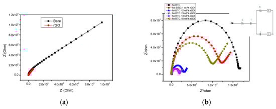 EIS comparison of (a) bare solution and rGO, and of (b) Ni-BTC-MOF and 1–5 wt % rGO composites in 1 M NaOH and 2 M methanol solution at peak potential 0.69 V.