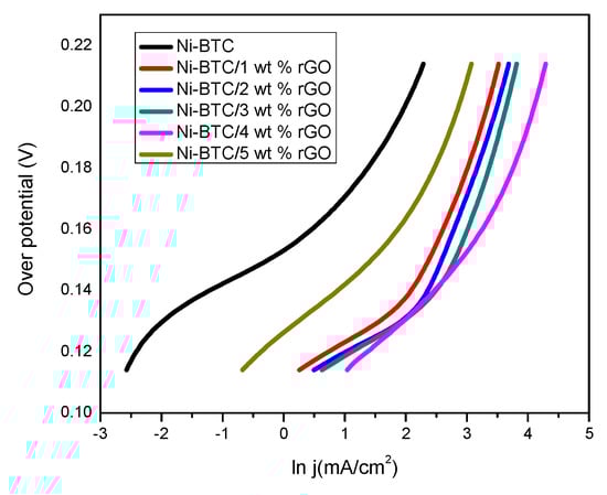 The Tafel plot helps in understanding the kinetics and reaction mechanism of the catalytic process by relating the overpotential with the natural logarithm (ln) of current density. Overpotential is the potential exceeding the required potential for a reaction to be carried out. Among synthesized samples, the maximum current density is retained by the Ni-BTC/4 wt % rGO composite at a specific overpotential, which might be caused by the availability of reaction sites for reactants after rGO incorporation, as shown in Figure 10. The Tafel slope, representative of kinetic behavior, is calculated with the following equation [61]: