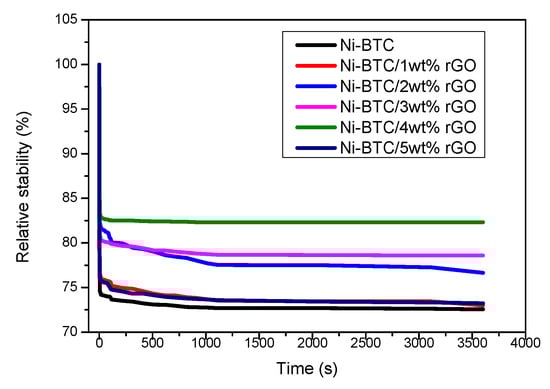 The relative stability of synthesized electrocatalytic materials was analyzed through chronoamperometric measurements by employing a three-electrode system in 1 M NaOH and 2 M methanol solution at a fixed potential of 0.69 V, as shown in Figure 11. These curve stability values do not illustrate the initial drop with 100% accuracy because of the adsorption of reaction intermediates, such as CO, COOH, and CHO, on the catalyst surface. After this, the relative stability reaches a steady state until 3600 s [70,71]. After the deployment of the set potential (i.e., 0.69 V for 3600 s), the highest stability is shown for Ni-BTC/4 wt % rGO, reaching up to 83%, which is possibly because of the 2D structure of rGO leading to high specific surface area, minimal charge transfer resistance, and tolerance to poisonous intermediates [69]. This is followed by Ni-BTC/3 wt % rGO at 80%, Ni-BTC/2 wt % rGO at 78%, Ni-BTC/1 wt % rGO at 74%, Ni-BTC/5 wt % rGO at 74.5%, and Ni-BTC at 73%. Ni-BTC-MOF shows a fast decline, in contrast to other catalysts (i.e., 1–5 wt % composites), and then shows a sluggish decline over time until reaching stability at 3600 s.