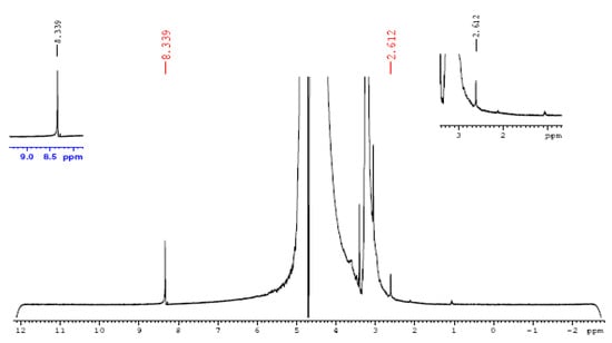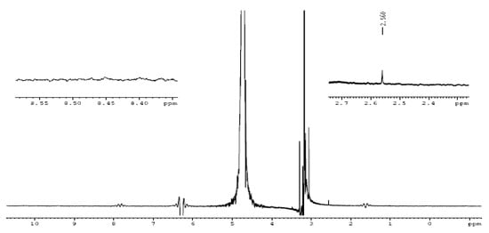 Electrocatalytic oxidation of methanol into CO2 can generate the maximum amount of electricity in direct methanol fuel cells, but high overpotential (0.45 V) is responsible for sluggish kinetics, even when using state-of-the-art Pt catalysts, because of poisoning of catalysts by intermediates in the oxidation process, such as CH, CH3, and COOH [72,73]. In this work, product identification and quantification of Ni-BTC/4 wt % rGO composite’s catalyzed methanol oxidation process was carried out by bulk electrolysis on a glassy carbon plate in 2 M methanol solution containing 1 M NaOH as a supporting electrolyte, as illustrated in Figure 12. At the start of the experiment, N2 was purged for 45 min to remove oxygen, after which the potential was fixed at 0.69 V for the oxidation process. Initially, the sharp decline in current density is because of the double layer charging process, but later on the constant current density (i.e., 199.6 mA/cm2) during bulk electrolysis for 1.5 h reflects the catalyst’s stability under catalytic turnover conditions [74]. The electrolytic product was collected after a 52.7 °C charge had been passed and was further analyzed by 1H NMR spectroscopy technique. Figure 13 symbolizes the NMR spectra of blank and Ni-BTC/4 wt % rGO composite, whereas Figure 14 represents the NMR spectra of reference electrolyte. The NMR spectra of Ni-BTC/ 4 wt% rGO composite after bulk electrolysis is shown in Figure 15. The possible products during bulk electrolysis are as follow: