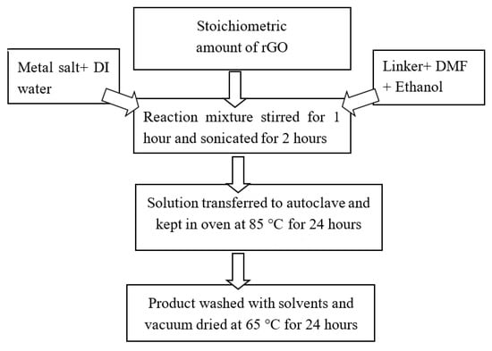 A series of rGO composites of Ni-BTC-MOF were synthesized using the abovementioned procedure. A linker solution prepared in DMF and ethanol was slowly added to the metal salt aqueous solution and stirred for 1 h. Subsequently, an appropriate amount of rGO was added to the MOF solution, followed by 2 h sonication to acquire a homogenous mixture. After this, the reaction mixture was poured into a Teflon-lined autoclave and kept in an oven for 24 h at 85 °C. the obtained solid product was then repeatedly washed with a mixture of solvents and dried in a vacuum at 65 °C for 24 h. The layout of synthesis scheme is given in Figure 16.