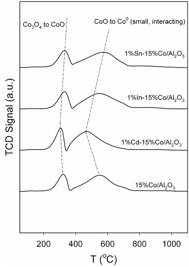 TPR profiles of, moving upward, 15%Co/Al2O3, 1%Cd-15%Co/Al2O3, 1%In-15%Co/Al2O3, and 1%Sn-15%Co/Al2O3. Catalysts prepared by SPI using 150 m2/g γ-Al2O3.