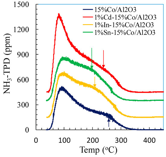 The NH3-TPD profiles of the unpromoted and the Cd, In and Sn promoted 15%/Al2O3 catalysts are shown in Figure 2. Two types of acidic sites (weak and mild to strong) are clearly identified with the corresponding NH3 desorption peaks present at ca. 90 °C and 200–260 °C, respectively. For the unpromoted cobalt catalyst, the first NH3 desorption peak is more intense than the second one, indicating the unpromoted cobalt catalyst surface was mainly covered by the weak acid sites (likely L sites). In the case of adding 1%Cd, the NH3 desorption amounts in both peaks increased greatly, but the first peak area exhibited a greater change, implying that addition of Cd resulted in a greater fraction of weak acid sites. However, for the In-promoted cobalt catalyst, the first NH3 desorption peak shows only a slight increase in the intensity, but the second one became more intense; moreover, the second peak slightly shifted to lower temperatures (i.e., 240 vs. 260 °C). Thus, addition of 1%In primarily promoted the strong acid sites. Interestingly, the Sn promoted cobalt catalyst displayed a similar NH3-TPD profile to that of the In promoted cobalt catalyst, suggesting a similar acid site density (e.g., B-sites) on the Sn and In promoted cobalt catalysts. However, the second peak moved to even lower temperatures relative to the Cd promoted and unpromoted cobalt catalysts. It can be observed that the higher the atomic number, the lower the peak temperature (i.e., 220 °C for the In-Co and 200 °C for the Sn-Co catalysts). The total amount of NH3 desorbed follows the order: Cd (119.3 µmol/g) > In (110.5 µmol/g) > Sn (104 µmol/g) > unpromoted (73.2 µmol/g).