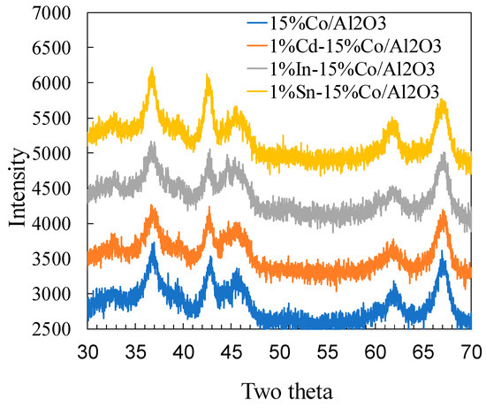 The XRD spectra of the four reduced cobalt catalysts are depicted in Figure 3. The unpromoted and the Cd, In and Sn promoted cobalt catalysts show similar XRD patterns in the 2θ range of 30°–70°. Five intense reflections are observed at 2θ of 36.9° and 61.9°, 42.9°, and 45.9°, 67°, representing the characteristic peaks of cobalt oxide, Co, and alumina, respectively. Interestingly, regardless of whether the unpromoted catalyst was used, or whether additives were used, the intensities for each peak for the four different cobalt catalysts are quite similar, suggesting that average cobalt cluster sizes are similar. Based on the Scherrer equation, cobalt cluster size for the unpromoted and Cd, In and Sn calculated at the 2θ of 42.9° are 12.7 nm, 11.4 nm, 12.5 nm and 11.1 nm, respectively, which suggests that addition of Cd, In and Sn on the cobalt catalyst only slightly decreased the cobalt cluster size, if at all. This result is not consistent with the H2-chemisorption results, which suggest an apparent increased Co cluster size with the addition of Cd, In and Sn. The discrepancy strongly suggests that the additives cover some surfaces of cobalt nanoparticles or block pores of the support. However, the latter reason can be excluded based on the BET results as discussed in Section 2.1.