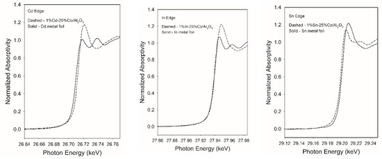 XANES spectra of 1%Cd-25%Co/Al2O3 (left), 1%In-25%Co/Al2O3 (middle) and 1%Sn-25%Co/Al2O3 (right) compared to the reference Cd, In and Sn metal foils.