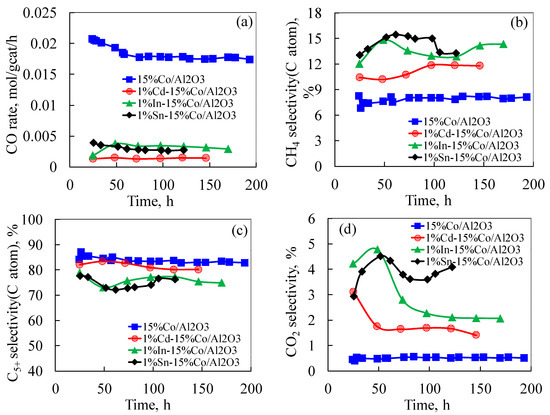 The effects of 1%Cd, 1%In and 1%Sn additives and time on CO rate, CH4, C5+ and CO2 selectivities are shown in Figure 5a–d and Table 2. The promoted catalysts were running at 20–30% CO conversion in the first ca. 50 h; afterwards, CO conversion was adjusted to the 40–50% level in order to better compare catalyst selectivities. The CO rate for the unpromoted catalyst was 0.022 mol/g-cat/h. The addition of 1%Cd, 1%In or 1%Sn additive drastically decreased the catalyst activity to 0.0015, 0.004 and 0.003 mol/g-cat/h, respectively, corresponding to very high rate loss percentages of 93%, 82% and 86% for the Cd, In and Sn additives, respectively. After adjusting CO conversion to 40–50% level after 50 h, the unpromoted cobalt catalyst and 1%Cd promoted catalyst displayed better stability, and the CO rate over the next time period of 100–150 h remained at ca. 0.017 mol/gcat/h for the unpromoted catalyst and ca. 0.0015 mol/gcat/h for the Cd promoted catalyst. However, the In and Sn promoted catalysts were slowly deactivating with time, with CO rate changes from 0.004 to 0.0028 mol/gcat/h and from 0.003 to 0.0025 mol/gcat/h for the In and Sn promoted catalysts, respectively. The significant decreases in cobalt catalyst activity caused by the additives are not consistent with the changes in the H2 chemisorption results as discussed in Table 1. In re-examining the H2 desorption results, the H:Co ratio is assumed to be 1:1, where “Co” refers to surface Co0 atoms. The addition of 1%Cd, 1%In and 1%Sn only led to cobalt site density decreases of 8.2%, 20.4% and 36.1%, respectively. Thus, it was expected to have similar activity losses percentages for the promoted catalysts, since the change in FT activity has been generally consistent with changes in H2 chemisorption capacities of cobalt catalysts resulting from different loadings of Pt, Re, Ru, Ag, and Au, and even Zr additives [5,6,7,8,16,17]. The activity of the Cd, In and Sn promoted catalysts being 3 to 10 times lower than the expected results strongly suggests that other reasons may account for the lowering in catalyst activity. During an investigation of Group 11 additives (i.e., the coinage metals–Cu, Ag, and Au), while all the additives facilitated cobalt oxide reduction, only the Ag and Au additives increased the catalyst activity on a per g of catalyst basis. All the catalysts had higher metal site densities by H2-TPD relative to the unpromoted 15%Co/Al2O3 catalyst, but Cu decreased catalyst activity; however, the difference in the adverse effects of the Cu additive were much less pronounced than that of the Cd, In and Sn additives in this study. Thus, H2-TPD only reports metal site density, and in the case of Cu, Cu0 was likely on the surface of the cobalt particles so that, while it on the one hand promoted reduction of cobalt oxides, it decreased the cobalt surface site density by blocking sites on the surface. However, BET results do not suggest pore blocking by cobalt and the additives.