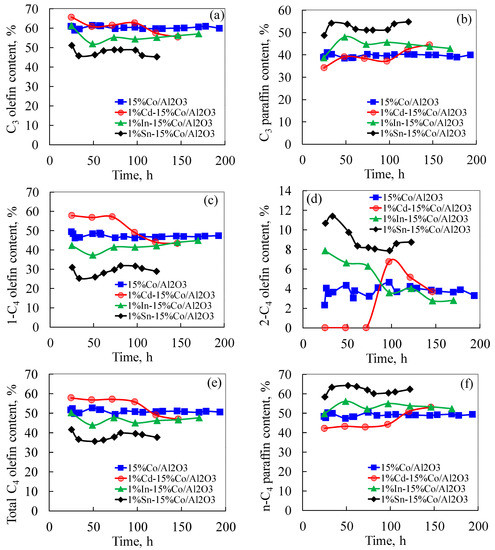 In our previous studies, Pd and Pt were found to increase CH4 (8–12%) and suppress heavier hydrocarbon formation (83–76%); and, Pd displayed much higher hydrogenation and isomerization activities (1-C4 olefin: 47–25%, 2-C4 olefin: 7–14.8%) [7,16]. Thus, the impact of Sn on the formation of olefins and paraffins resembles that of Pd.