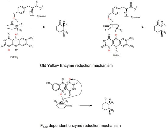 - Mathew, S.; Trajkovic, M.; Kumar, H.; Nguyen, Q.-T.; Fraaije, M.W. Enantio- and regioselective ene-reductions using F420H2-dependent enzymes. Chem. Commun. 2018, 54, 11208–11211. [Google Scholar] [CrossRef]