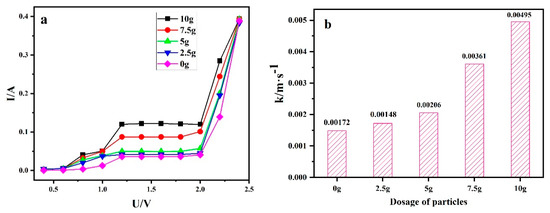 Figure 1a shows the ampere-voltage curve of 2.5D electrode system under different magnetic particle dosage. As shown in Figure 1a, one can find that the ampere-voltage curve of the 2.5D electrode at different particle dosage has the current plateau. When the particle dosage increased from 0 to 5 g, the plateau current value increased slowly. When the particle dosage increased to 7.5 g and 10 g, the plateau current value was significantly higher than the data when the particle dosage was 0 g. The mass transfer coefficient can be calculated by combining the current platform value with equation 1, as shown in Figure 1b. The corresponding mass transfer coefficients were 0.00148, 0.00172, 0.00206, 0.00361, and 0.00495 m·s−1 when the particle dosage was 0 g, 2.5 g, 5 g, 7.5 g, and 10 g. The data confirmed that the addition of particle dosage could increase the electrochemical system mass transfer coefficient.